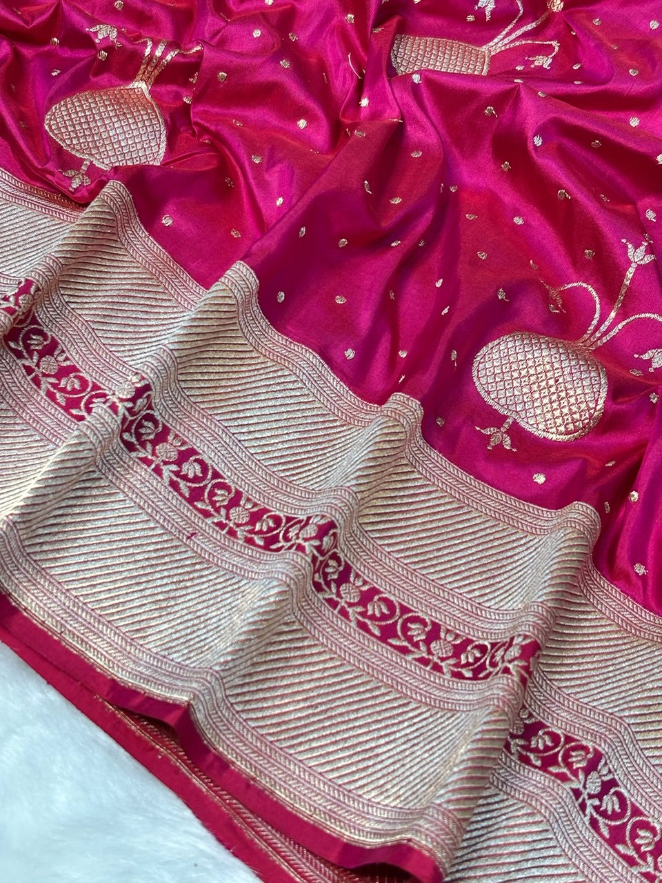 Vibrant, elegant, and timeless, this Apple Red  Handwoven Pure Banarasi Silk Saree showcases the artistry and skill of Banaras master weavers. Crafted from 100% pure Katan mulberry silk, the saree offers a smooth texture, natural sheen, and graceful drape that defines authentic Banarasi luxury.