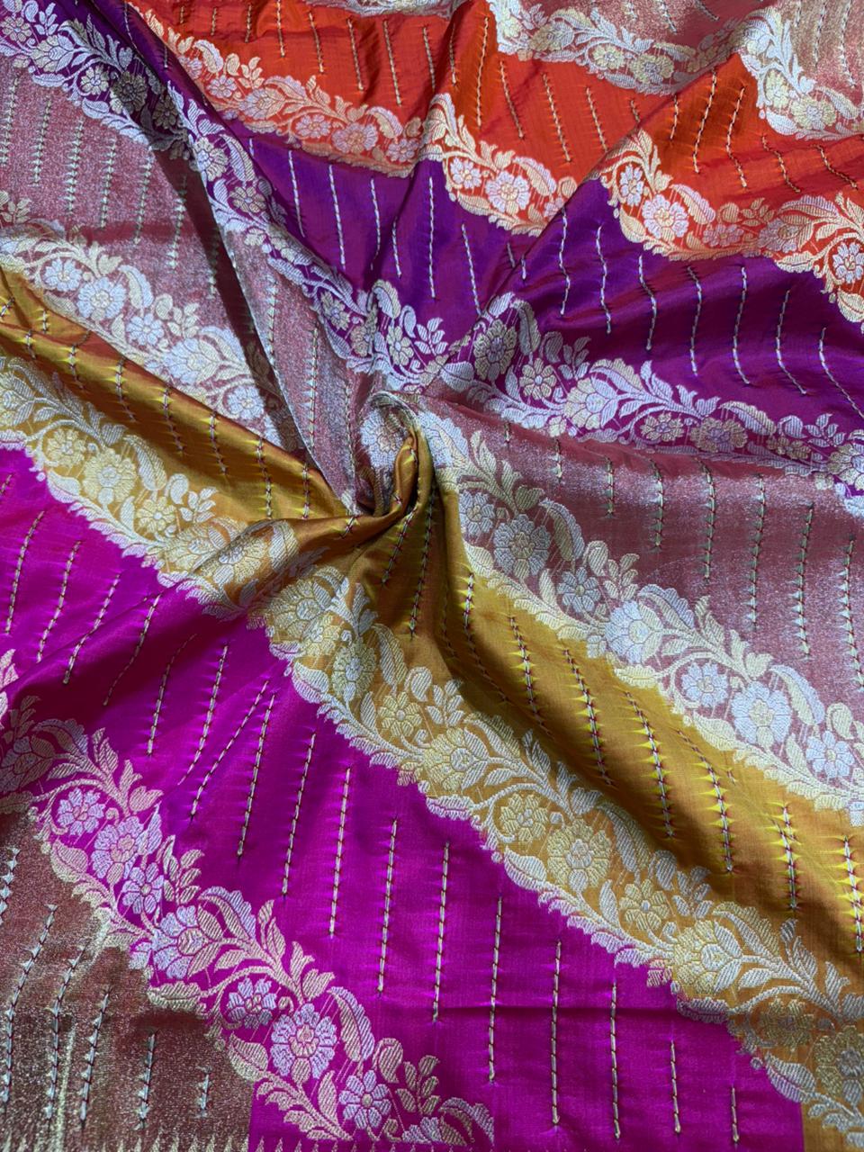 This stunning Red Katan Silk saree represents the pinnacle of Banarasi weaving excellence. Crafted from luxurious katan silk, it features intricate rangkaat embellishments complemented by shimmering zari work adorning the traditional Banarasi border and anchal. The deep red tone symbolizes elegance and celebration, making it an ideal choice for weddings, festivals, and formal gatherings. The saree's superior fabric quality ensures a graceful drape and lasting comfort. Each detail reflects meticulous artisanal craftsmanship, from the ornate border patterns to the richly embellished pallu. A timeless investment piece that honors heritage weaving traditions while delivering uncompromising sophistication and style.