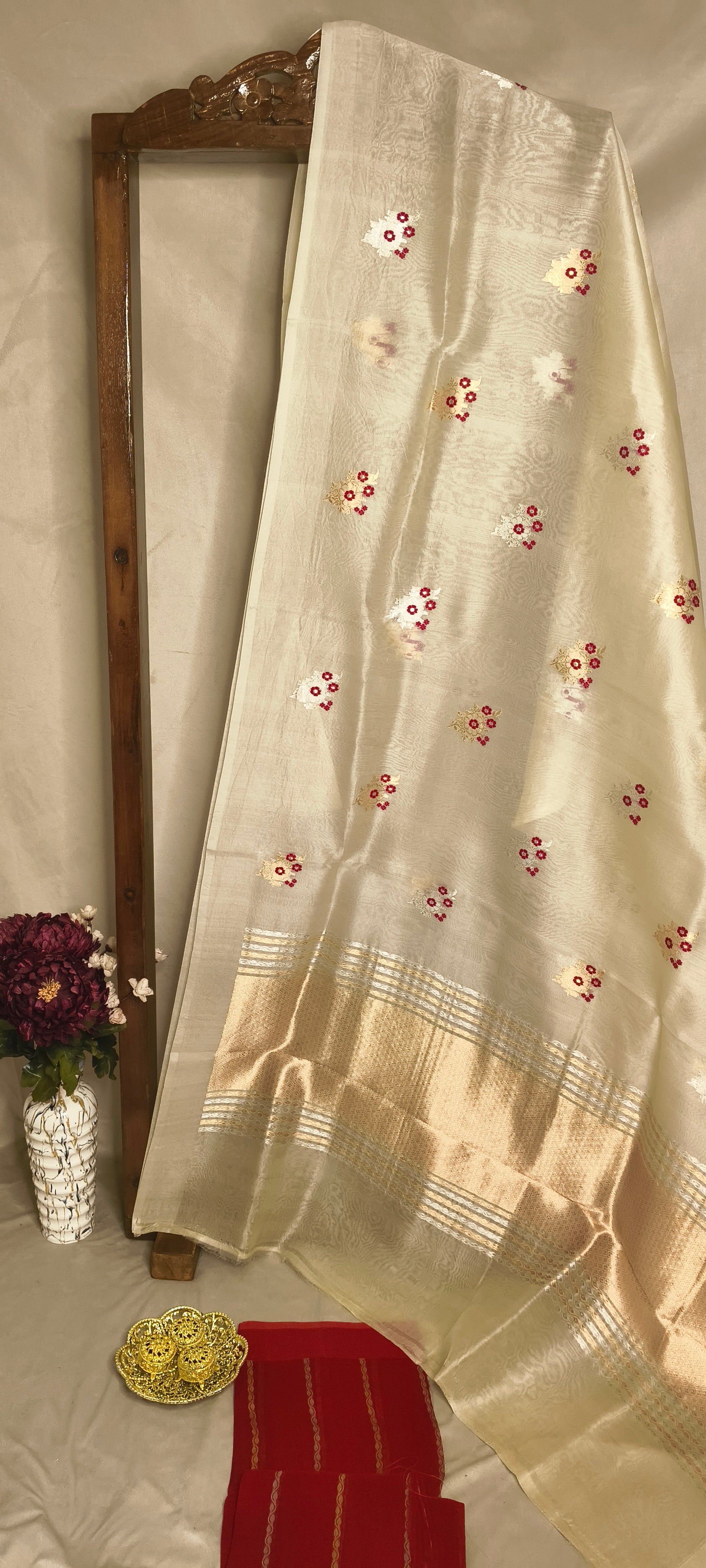 Discover understated luxury in this exquisite worm kora silk saree, a masterwork of refined weaving artistry. The kadhua technique showcases intricate mina boota embroidery with exceptional precision, creating delicate floral motifs that demonstrate remarkable craftsmanship. The plain open border design offers contemporary minimalism while allowing the fabric's inherent beauty to command attention. Worm kora silk, prized for its lustrous sheen and luxurious drape, provides an elegant foundation that elevates any occasion. The included contrast red blouse adds versatile styling options, complementing the saree's sophisticated aesthetic. Perfect for those who appreciate subtle elegance over ornate embellishment, this piece transitions seamlessly from formal celebrations to evening gatherings. The authentic silk construction ensures exceptional durability and longevity, establishing it as a treasured investment. Ideal for discerning patrons seeking to honor traditional craftsmanship while embracing contemporary design sensibility. A timeless choice that celebrates refined personal expression through superior textile quality and understated sophistication.