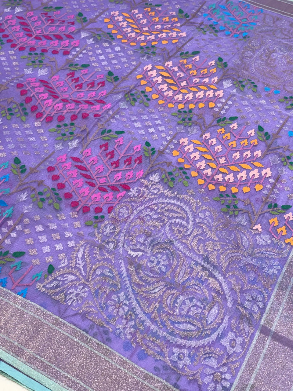 Lavender Pure Cotton Jamdani Real Gold Silver Zari Handwoven Saree