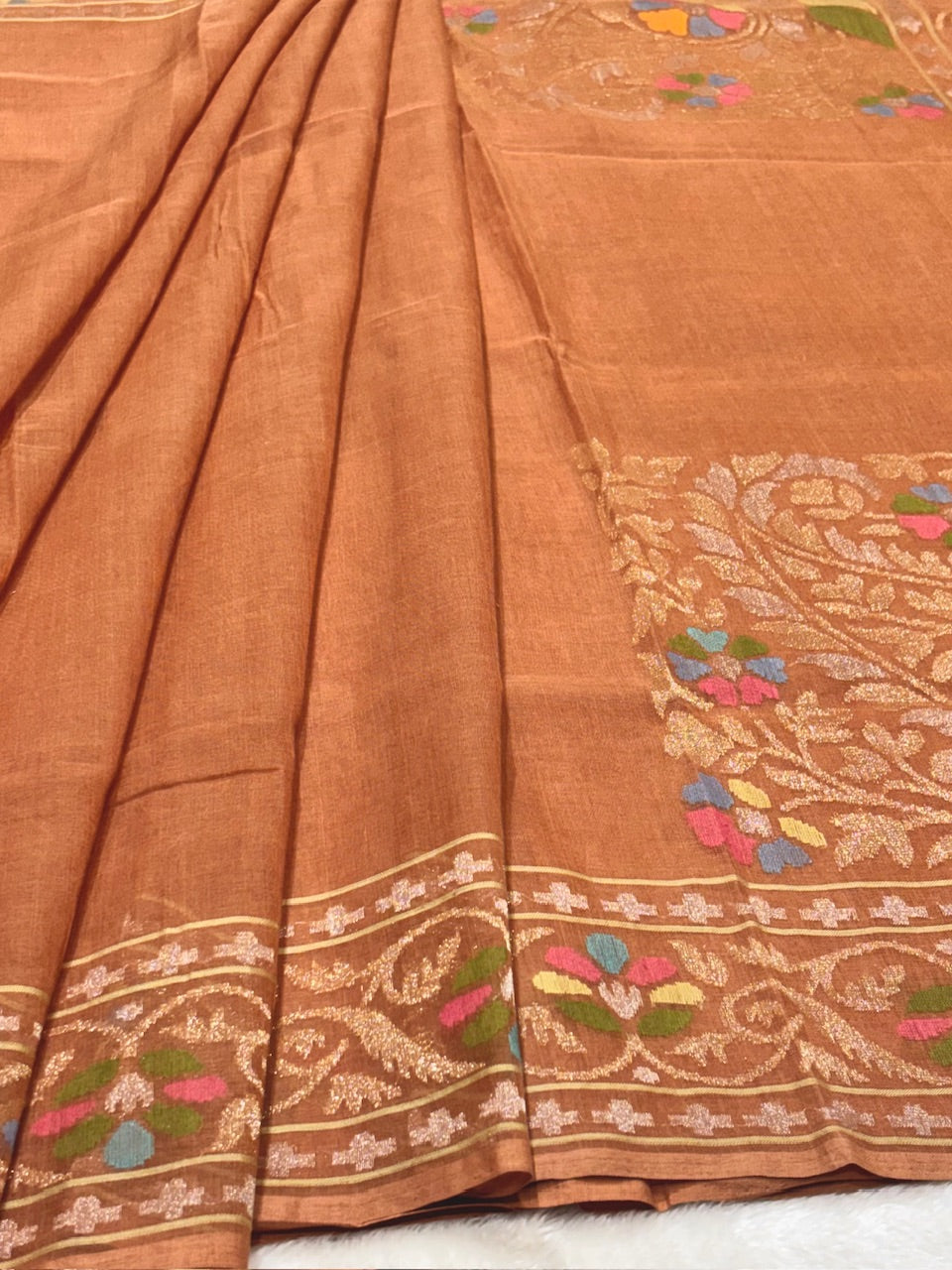 Natural Copper Peach Pure Cotton Jamdani Real Gold Silver Zari Handwoven Saree