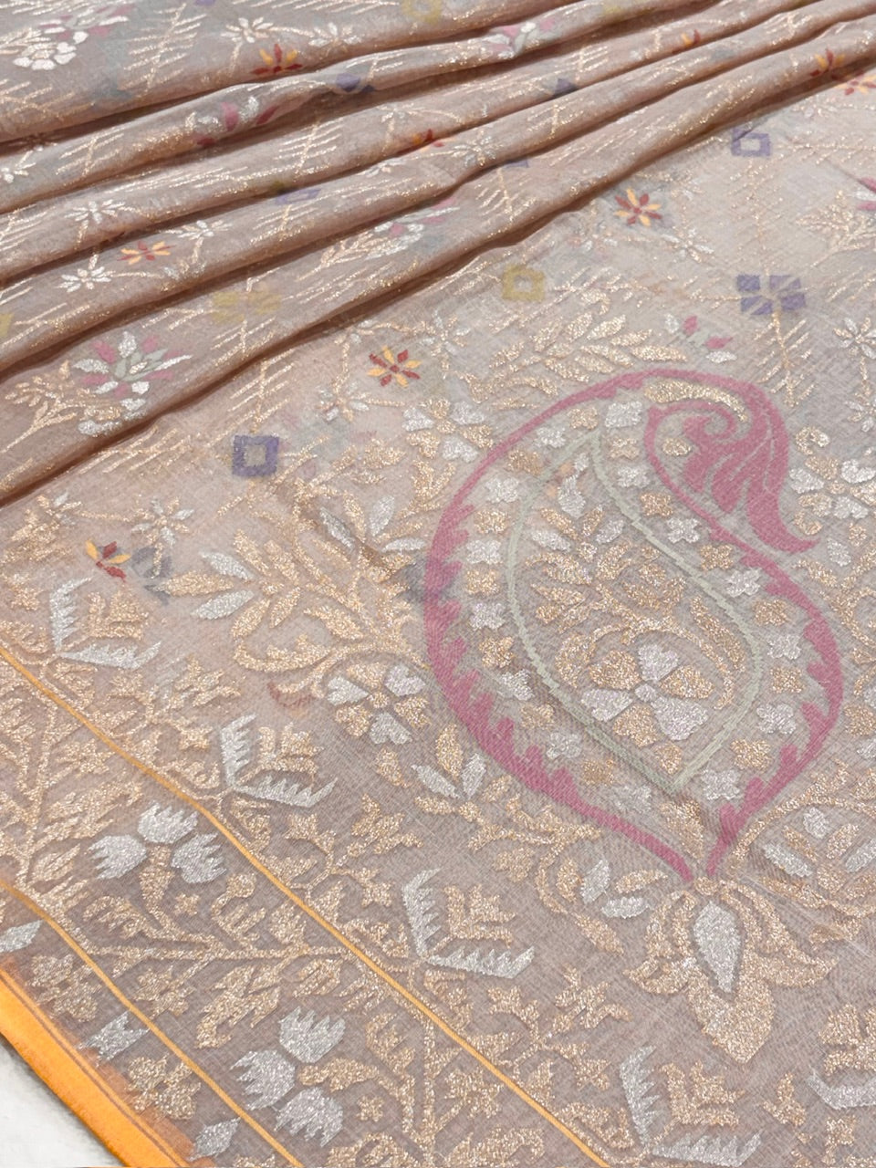 Natural Sandstone Grey Pure Cotton Jamdani Real Gold Silver Zari Handwoven Saree
