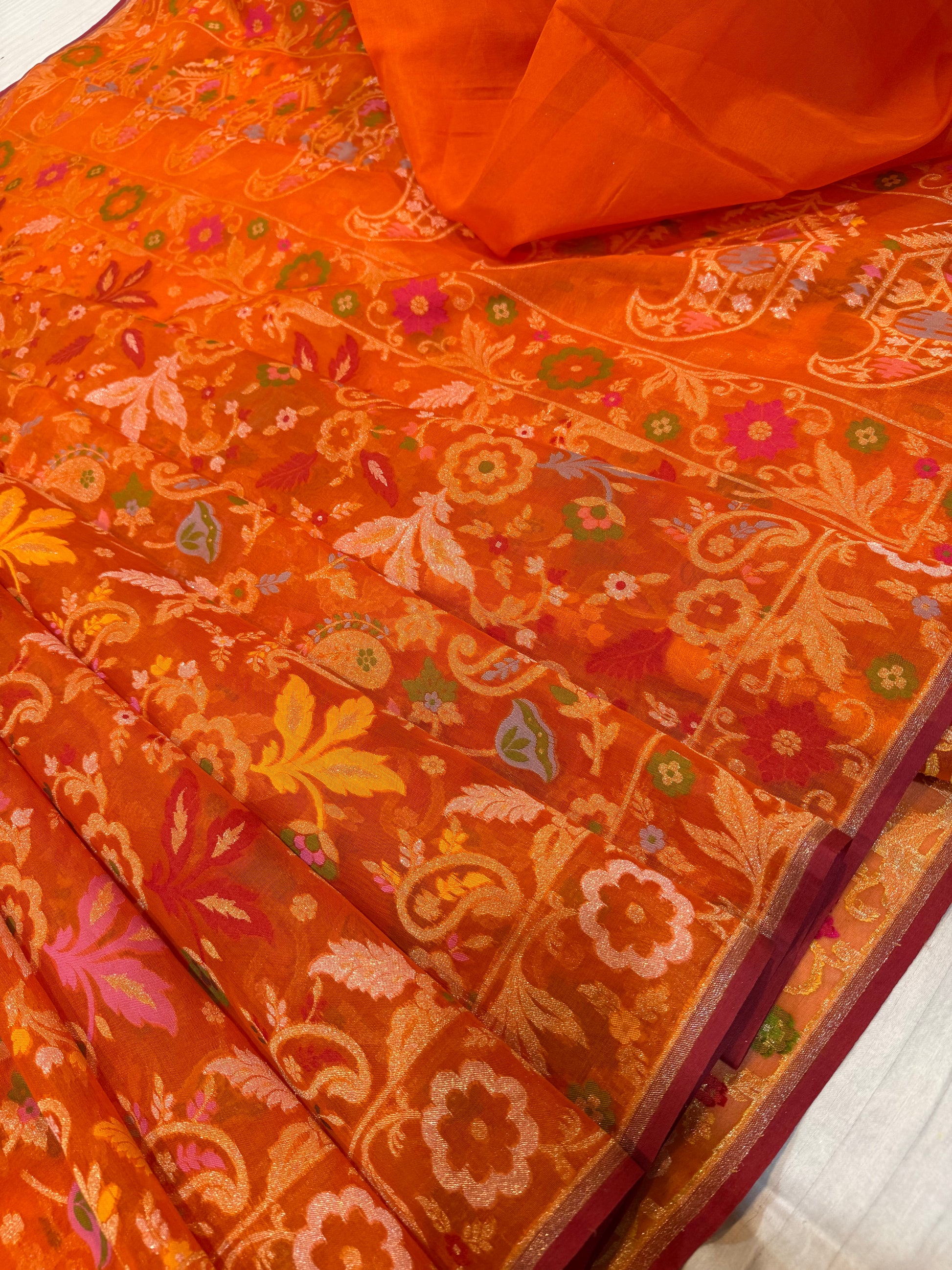 Orange Ektra kora silk Jamdani katwork Zari Border Anchal Mina Work Saree