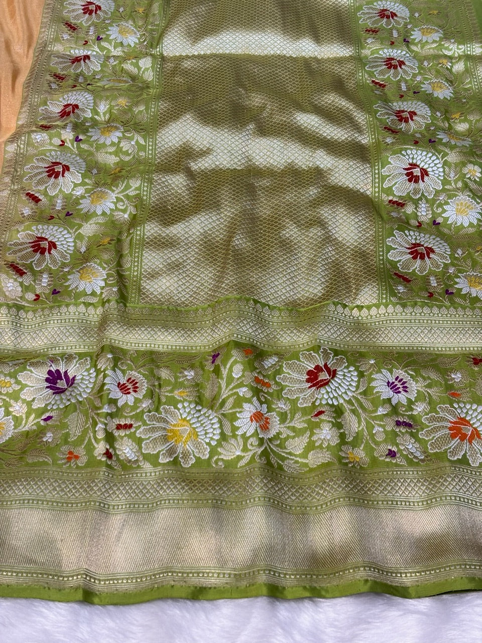 This beautiful saree is made from pure Banarasi tissue silk, handwoven with expert craftsmanship. Featuring delicate Minakari motifs, this Cream saree is a true masterpiece. Its intricate design and luxurious material make it the perfect choice for any special occasion. Elevate your style with this stunning and elegant saree.